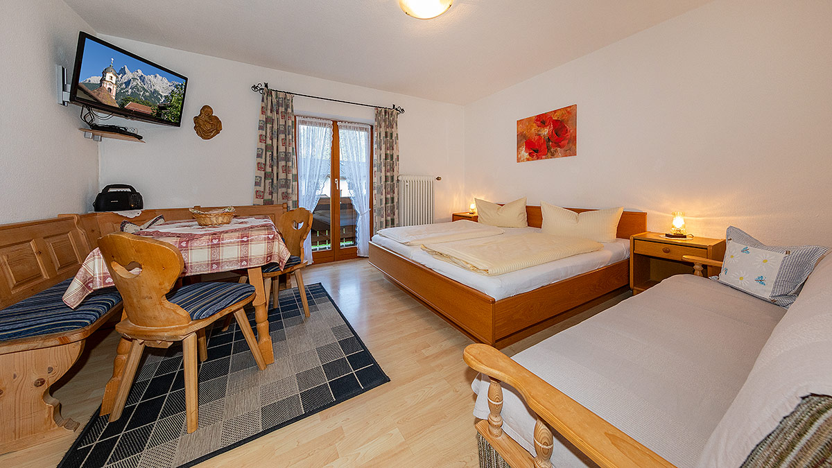 Die Nichtraucher-Wohnung liegt im 1. Stock und besteht aus Wohn-Schlafraum mit SAT-TV, Küche, Dusche/WC und Südbalkon mit freiem Bergblick.