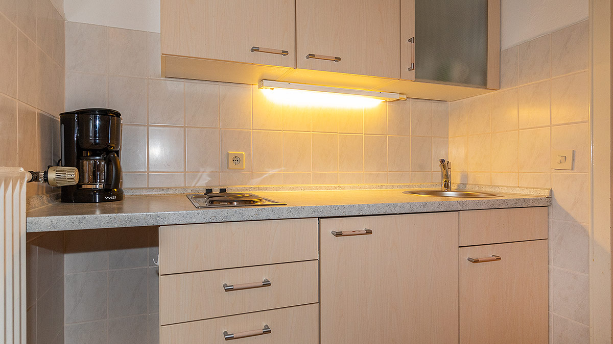 Die Küche ist ausgestattet mit Kühlschrank, 2 Kochplatten, Kaffeemaschine, Wasserkocher, Toaster und sämtlichem Geschirr.