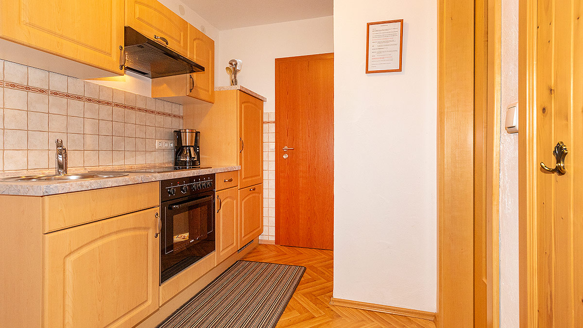 Die Nichtraucher-Wohnung liegt im 1. Stock und besteht aus Wohn-Schlafraum mit SAT-TV, ein Schlafzimmer, Küche, Duche/WC und Südbalkon mit freiem Bergblick. Die Küche ist ausgestattet mit Herd mit Cerankochfeld, Backofen, Kühlschrank, Kaffeemaschine, Wasserkocher, Toaster und sämtlichem Geschirr.