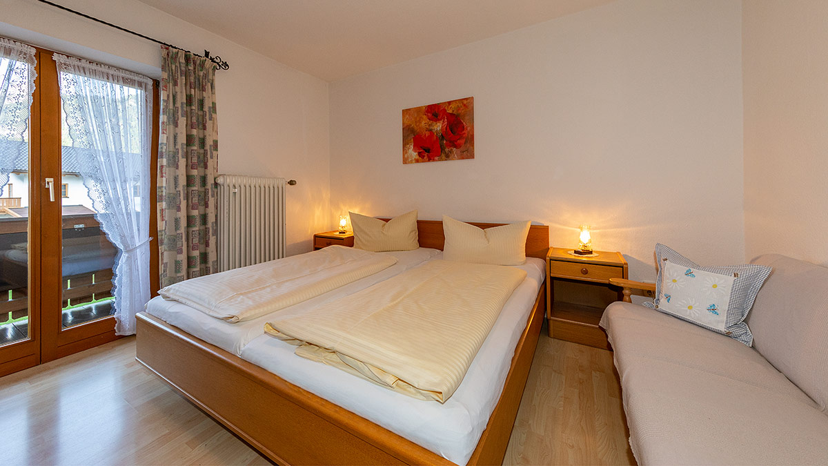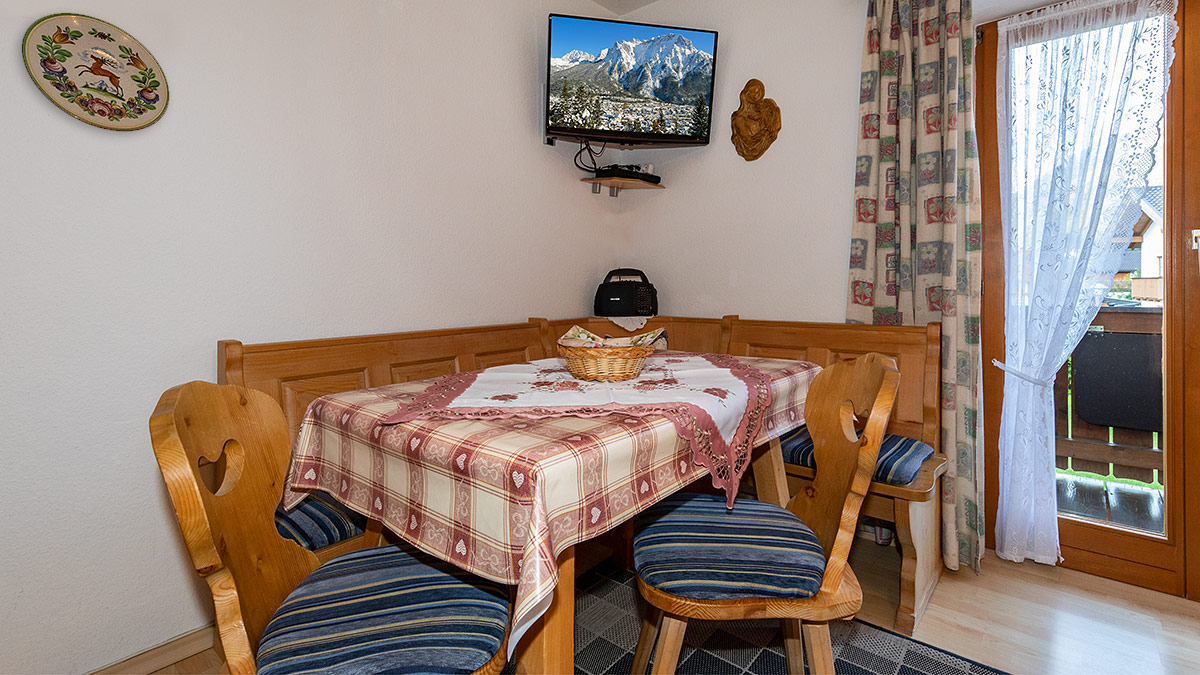 Die Nichtraucher-Wohnung liegt im 1. Stock und besteht aus Wohn-Schlafraum mit SAT-TV, Küche, Dusche/WC und Südbalkon mit freiem Bergblick.