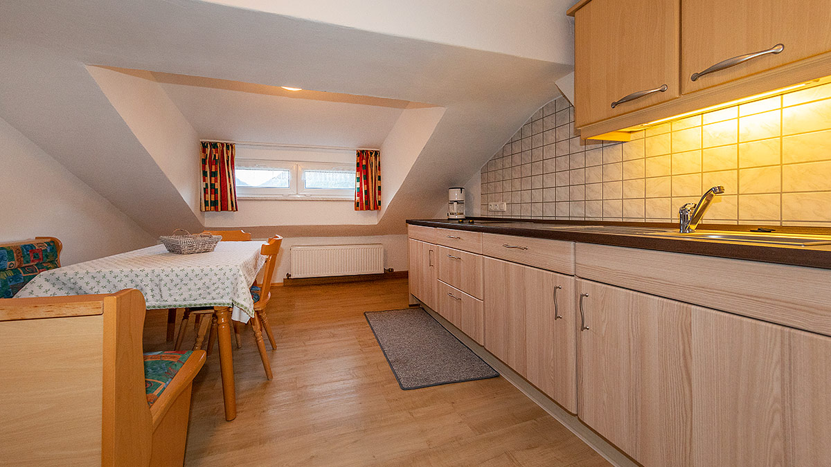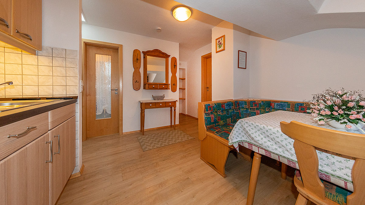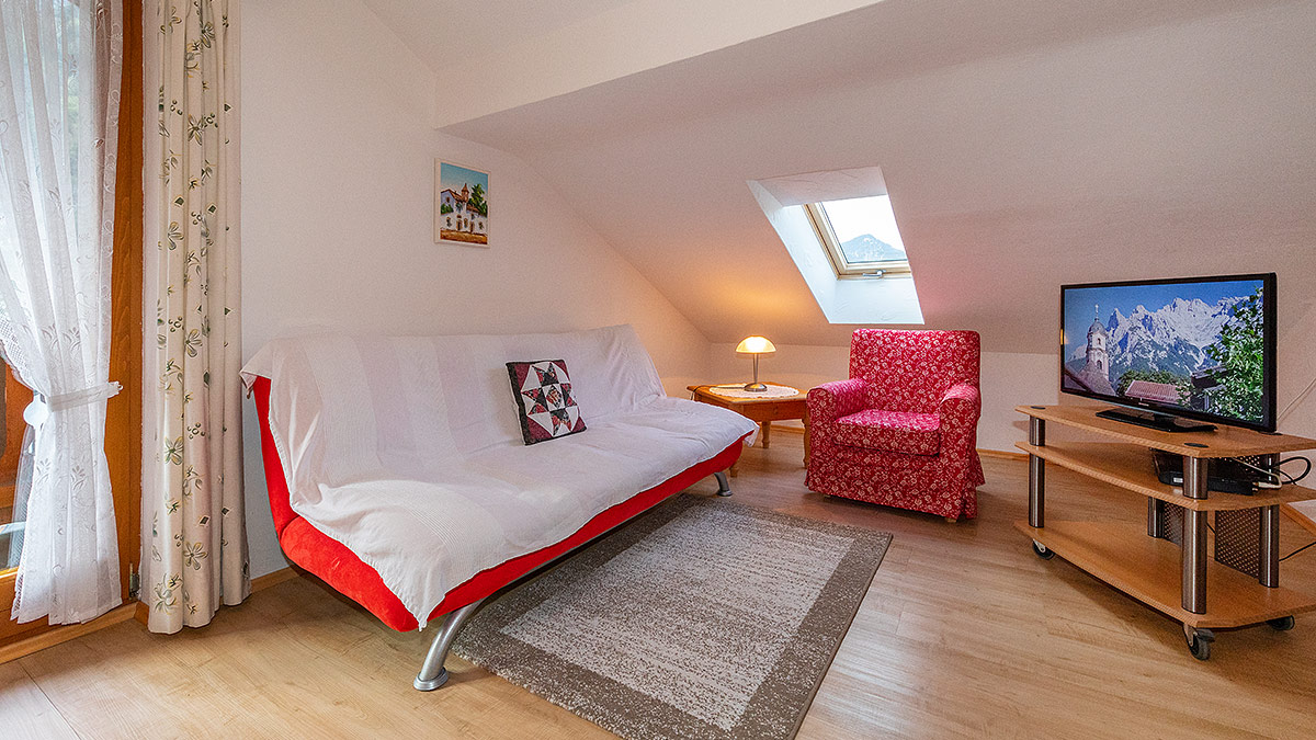 Die Nichtraucher-Wohnung liegt im 2. Stock und besteht aus Wohn-Schlafzimmer, einer Wohnküche mit SAT-TV, Dusche/WC und Ostbalkon mit freiem Blick zum Karwendel. Die Küche ist ausgestattet mit Kühlschrank, 2 Kochplatten, Kaffeemaschine, Wasserkocher, Toaster und sämtlichem Geschirr.